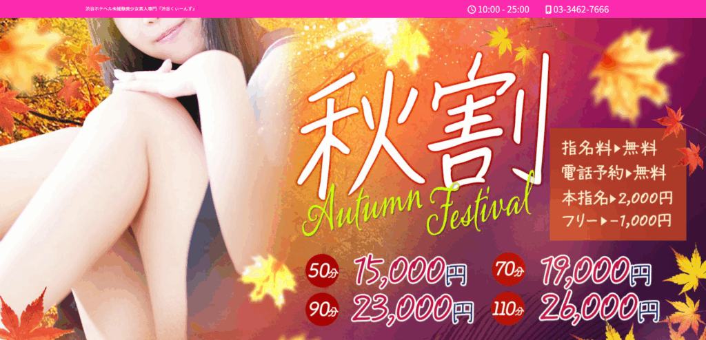 業界未経験の女の子だけを集めた素人専門店「渋谷くぃーんず」。女の子の年齢層は18歳~22歳と若く、清楚系・ロリ系・可愛い系が集まっています。